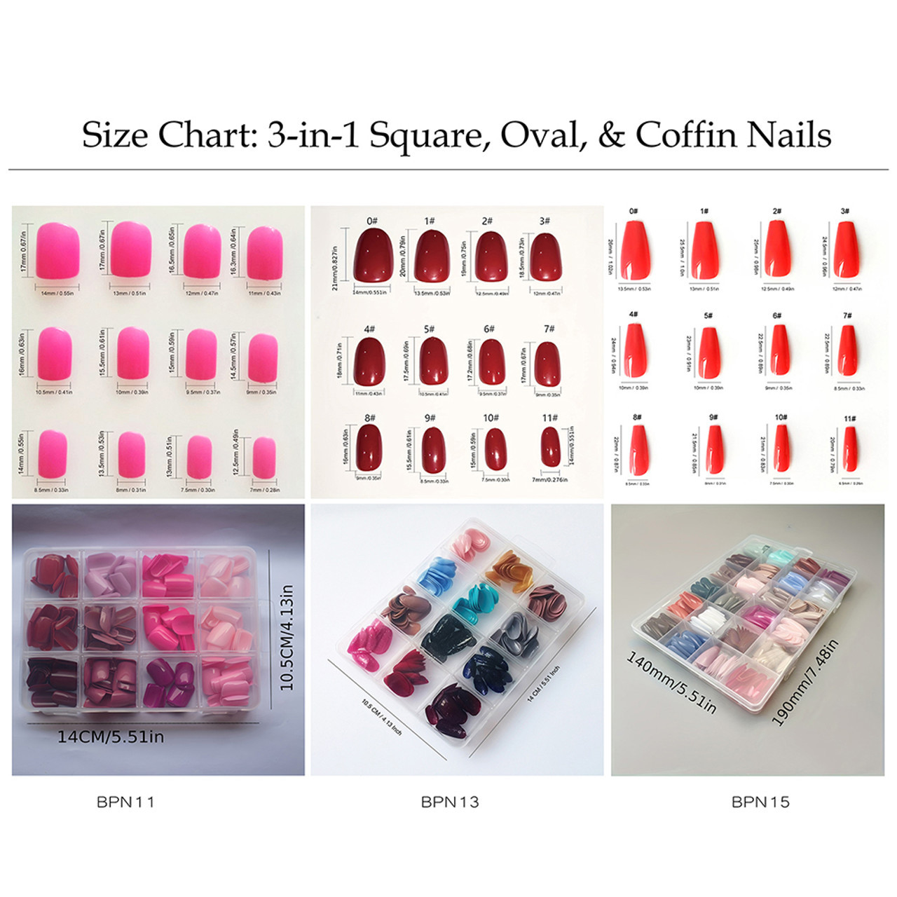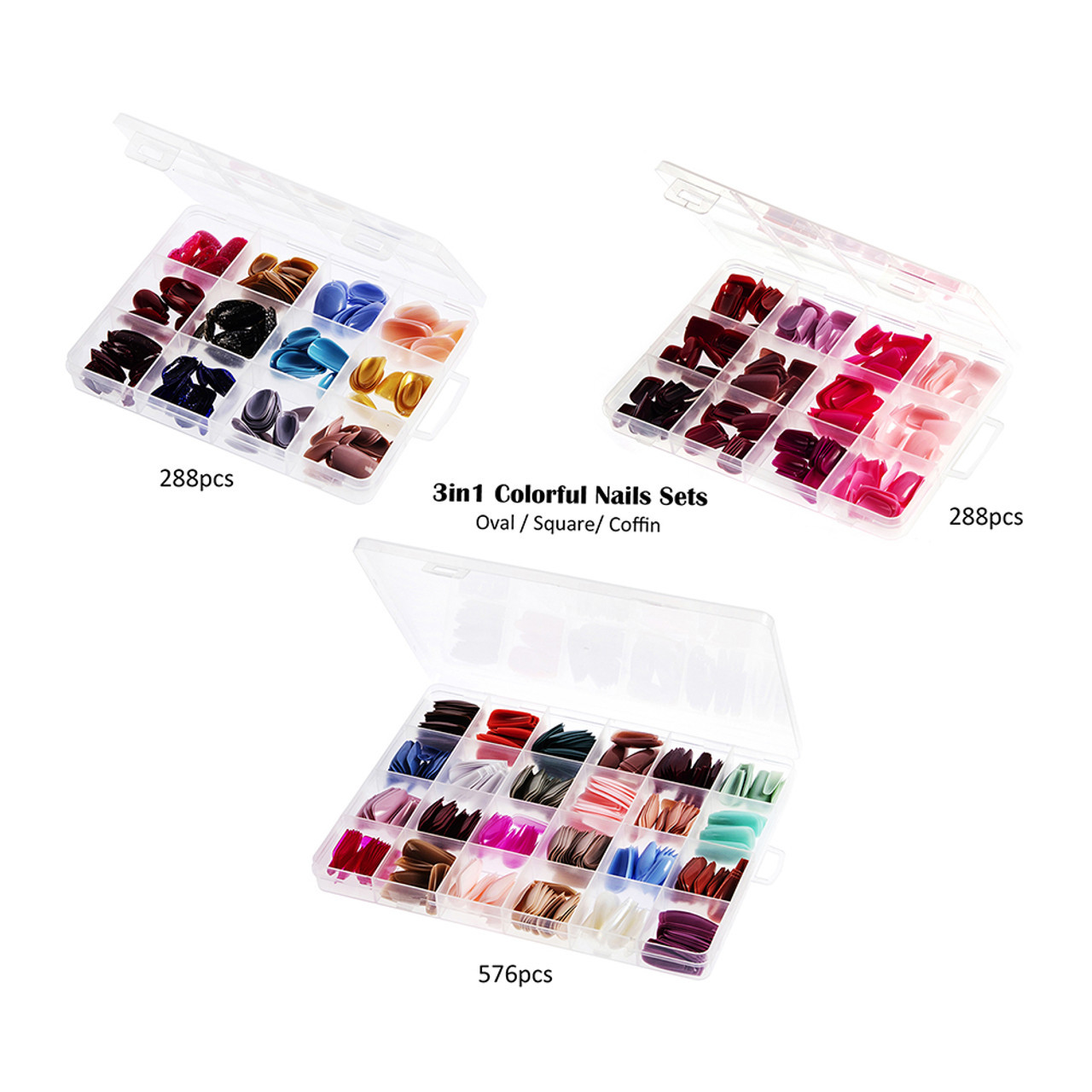 - Variety Pack: Includes 1152 acrylic nails in assorted colors, shapes (oval, square, coffin), and lengths (short, medium).